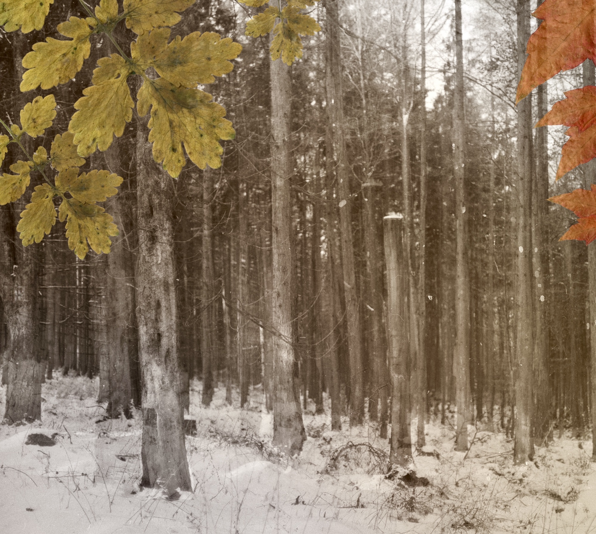 Eigentlich bearbeite ich gerne so wenig wie möglich, doch dieses Mal probierte ich es gepresste Blätter einzuscannen und auf das Bild zu legen. Und jetzt Augen und Ohren zu: auf digitale Doppelbelichtungen, die ursprünglich zwei analoge Mittelformataufnahmen waren. Früher hätte ich laut aufgeschrien. Innerlich wehrt sich ein Teil noch vehement gegen allzu viel digitalen Einsatz und ich glaube, er wird auch nicht kleiner werden, dieser Teil. Aber es öffnet neue Türen, wenn Platz und Werkzeug fehlen.